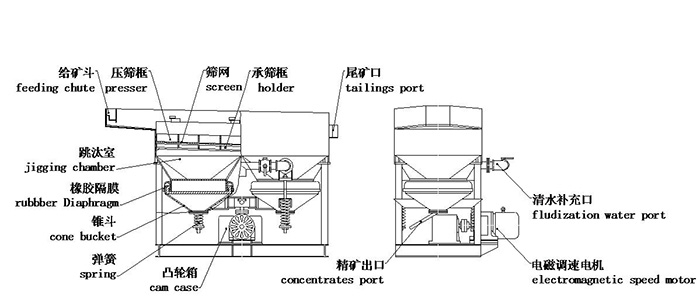 設備主要由:給礦斗、跳汰室、壓篩框、篩網(wǎng)、承篩框、錐斗、橡膠隔膜、彈簧、凸輪箱、電磁調(diào)速電機、清水補充口、精礦口、尾礦口等構(gòu)成。
